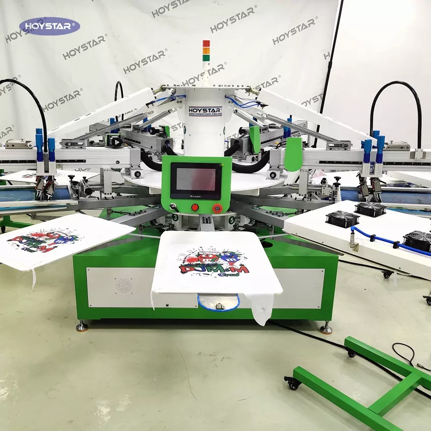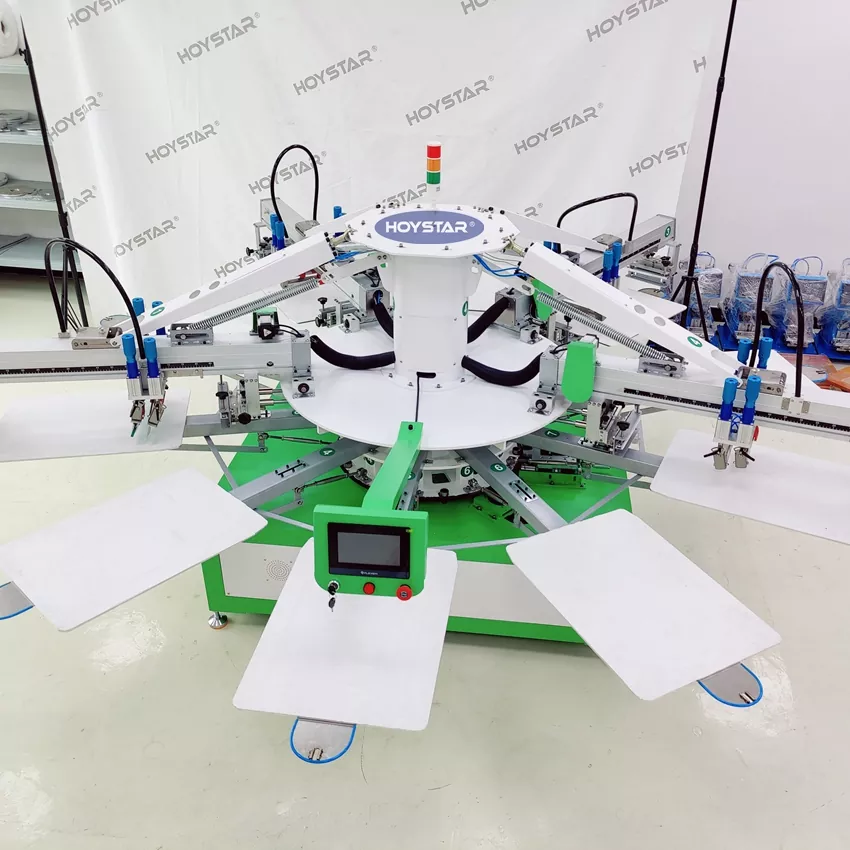 See HOYSTAR 4 värviline T-särgi tekstiiltrükkimise siiditrükimasin on loodud spetsiaalselt trükitööstusele. See on varustatud intelligentse mikroprotsessori, puutetundliku ekraani ja mootoriga juhitava süsteemiga, mis tagab kõrge printimisstabiilsuse ja värvide registreerimise tolerantsi ±0,1 mm piires, parandades oluliselt printimise täpsust ja järjepidevust. Sobib erinevatele printimisrakendustele, nagu T-särk, riided, etiketid ja kangas. See automaatne siidiprinter on teie ideaalne lahendus ülitäpseks ja tõhusaks trükitootmiseks.