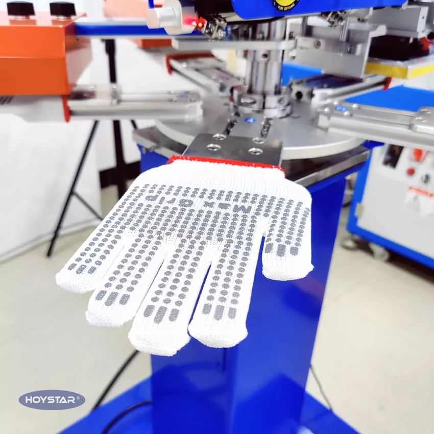 Professionaalse tootja ja tarnijana on HOYSTAR High Rapid Non Slip Gloves siiditrükimasin mõeldud kasutamiseks tekstiili kudumistööstuses. Kiirusega kuni 1000tk/h, sobib töökinnaste, puuvillaste, kootud kinnaste jms trükkimiseks. Pöörleva töölauaga varustatud kinnaste peale- ja mahalaadimine on väga mugav. PLC puutetundliku ekraani juhtimine, väga lihtne kasutada. Kuivatussüsteemiga varustatud masin suudab räni ja tinti hästi kuivatada.